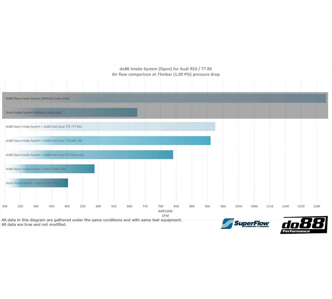 Tests conducted in our SuperFlow SF1020 flow bench, clearly demonstrates the importance of this optional inlet hose. The inlet pipe alone offers a substantial 12 % airflow increase. Combined with the 4,5” do88 inlet hose, the overall airflow increase is a whopping 65 %! We strongly recommend this combination.