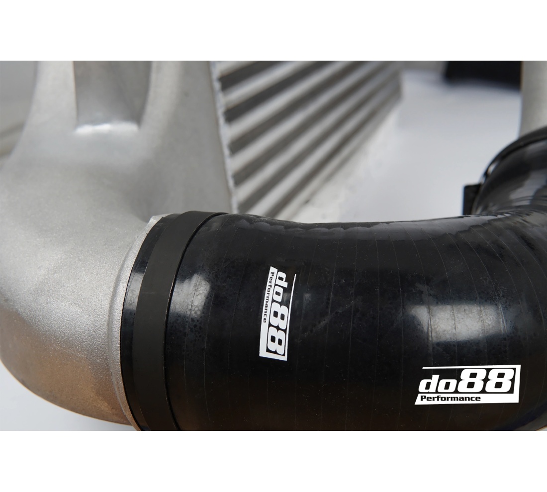 On the hot side (Turbo->Intercooler) our kit features a large 70mm (2 ¾") aluminium pipe that does not have the restrictive flat design found between the engine and the inner wheelhouse as on the OEM pipe. On the cold side (Intercooler->Throttle body) our cast aluminium charge pipe runs all the way from the throttle body down to the intercooler outlet. This pipe has a huge 86mm hose connection towards the intercooler compared to the OEM's 64mm. This connection matches the inner diameter of the do88 Performance Intercooler's large 80mm hose connection. The pipe also features two CNC-machined 1/8 NPT connections, perfect for methanol injection or outlets for example boost pressure sensors.