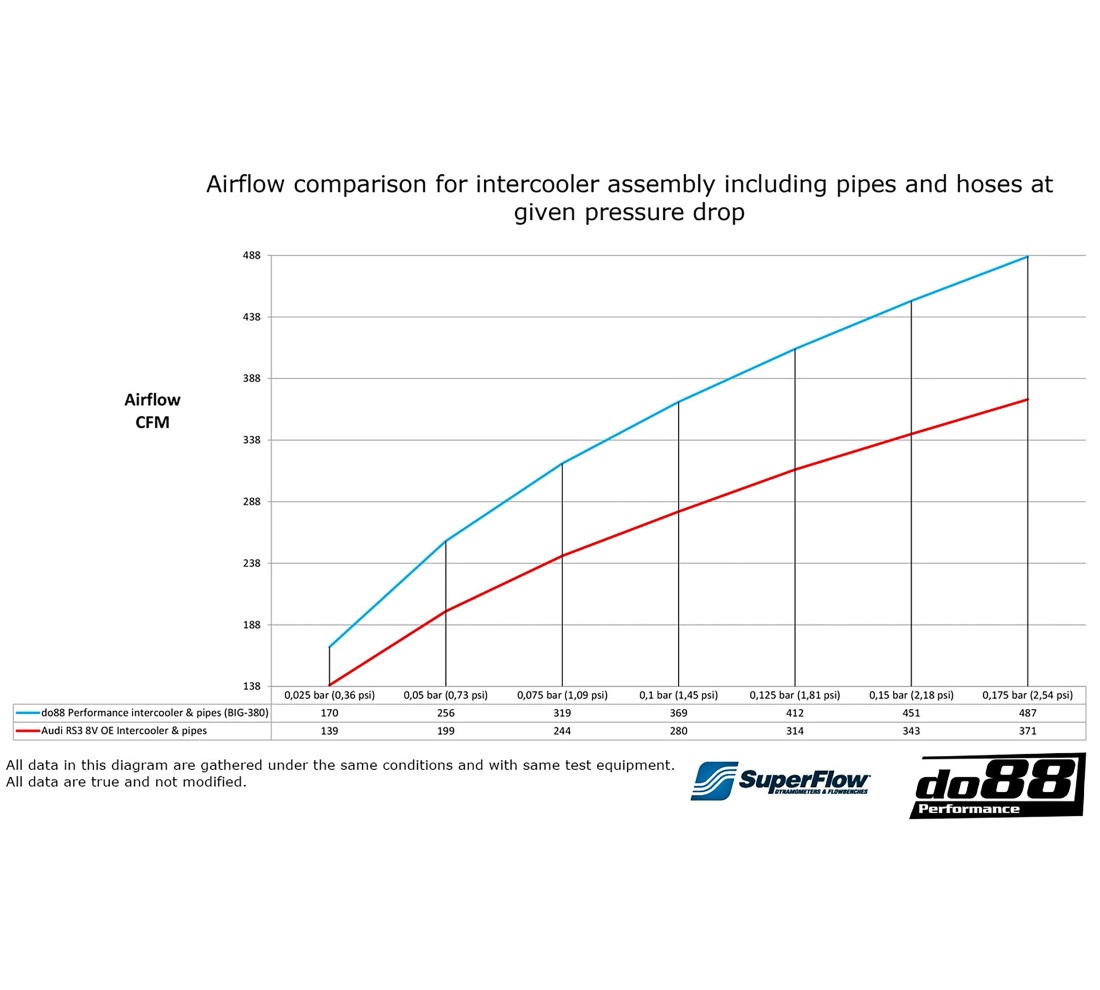 The included do88 charge pipe kit is designed to complement and improve the performance of the do88 Performance Intercooler. The OEM charge pipes have several inefficient bends and do not have a performance-optimized design. Our charge pipes is both significantly larger and fully flow-optimized, making it flow 31% more than the OEM!