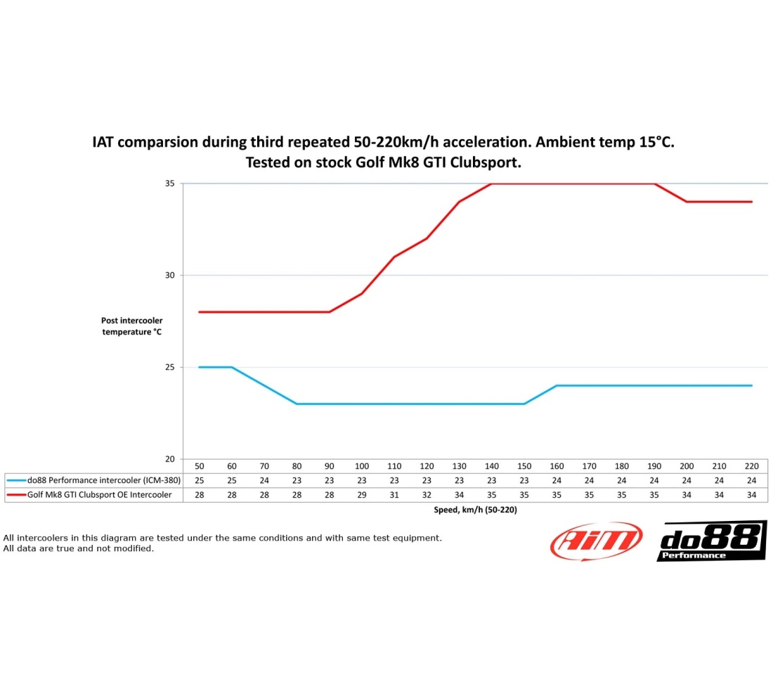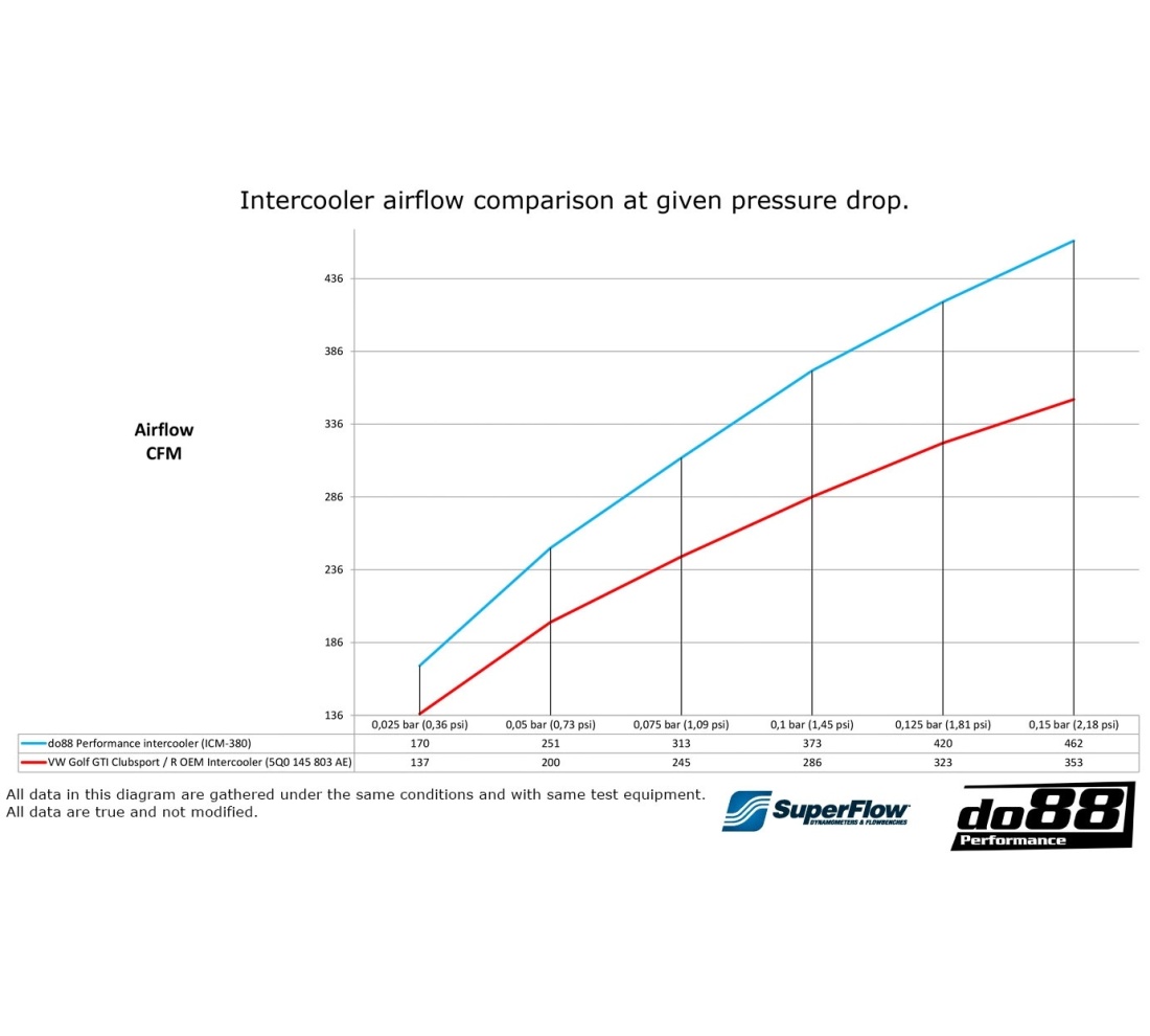 Comparing the do88 performance intercooler to the VW Golf GTI OEM intercooler reveals substantial improvements designed for performance driving: