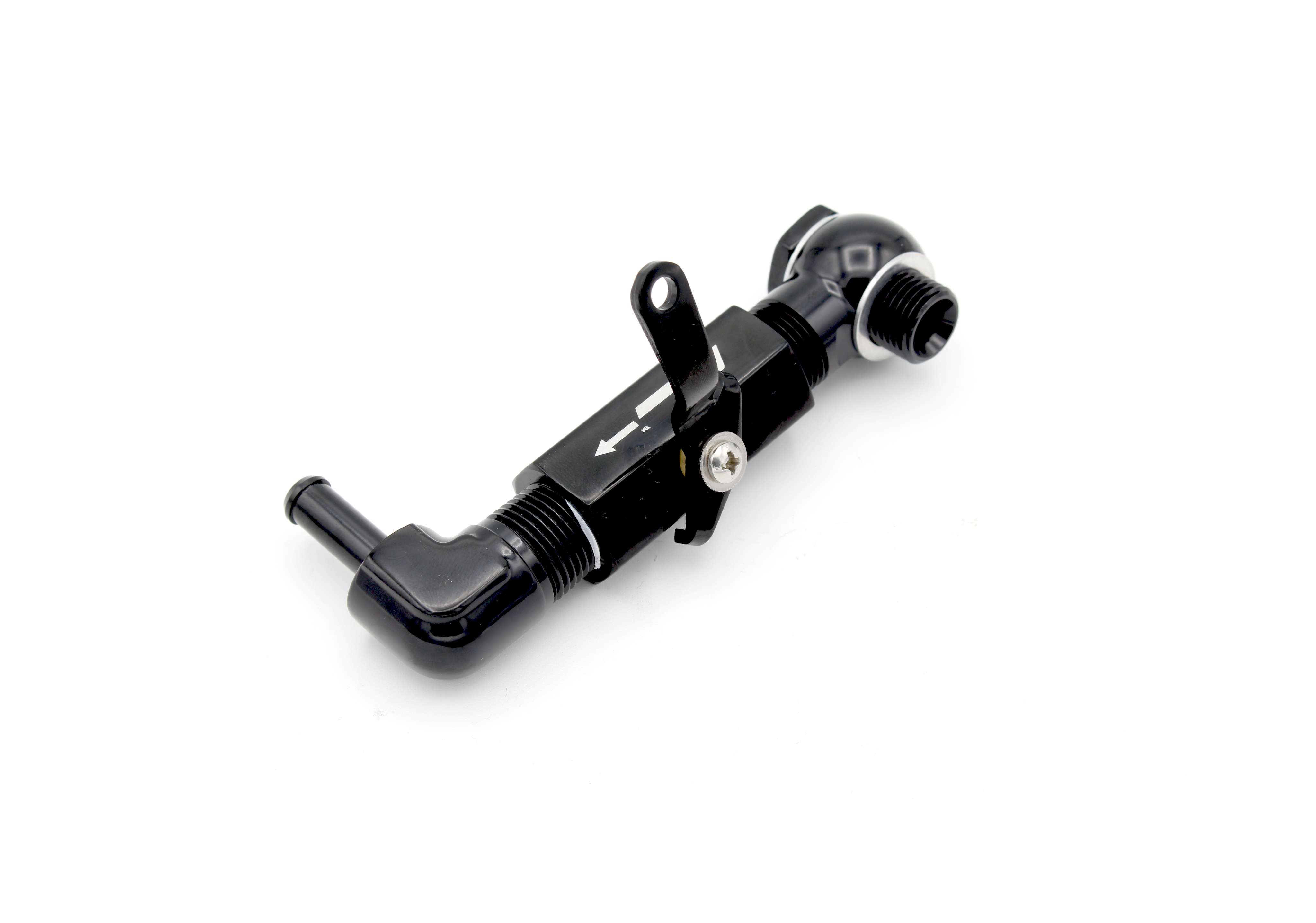 > A banjo take off bolt screws into the bottom of catch can, adjustable to any angle