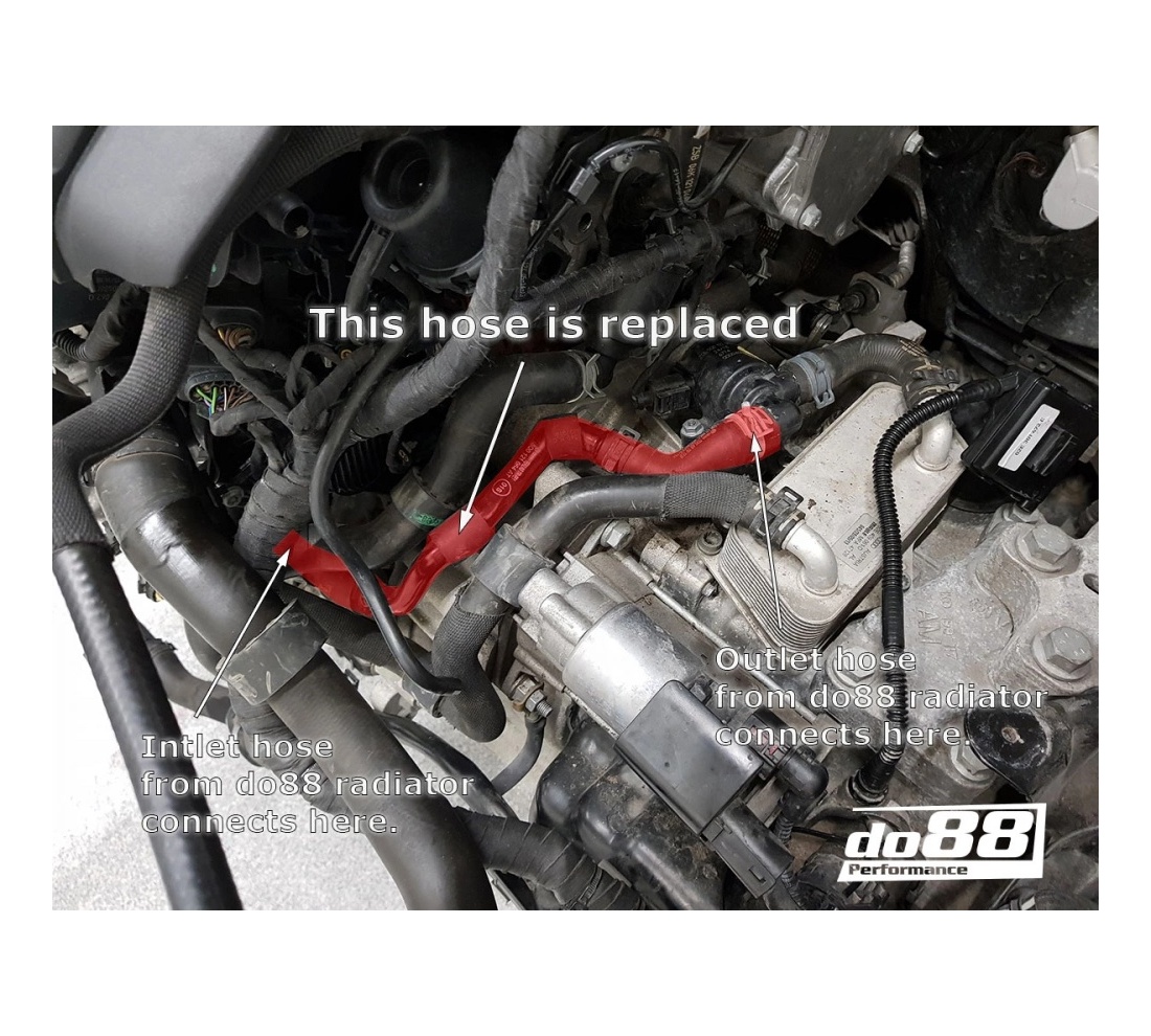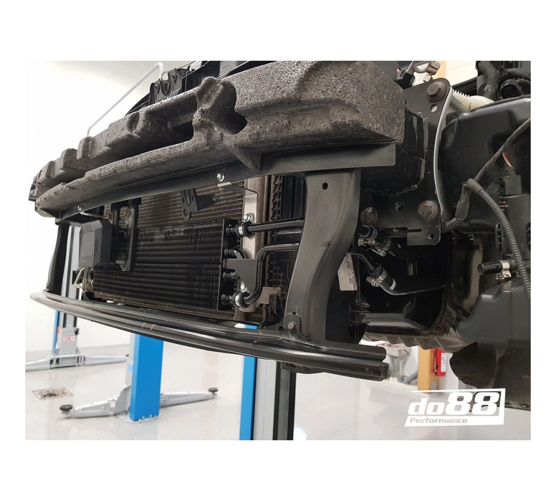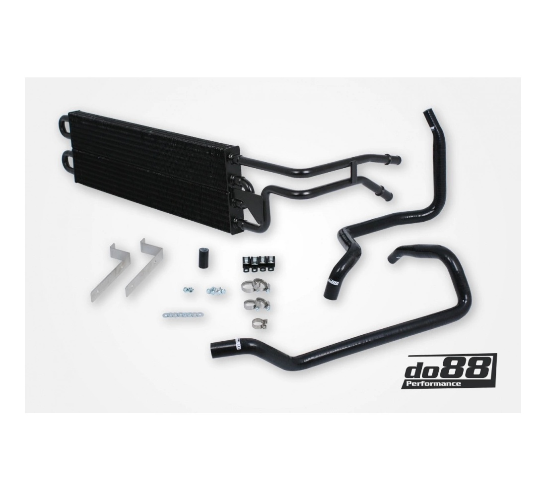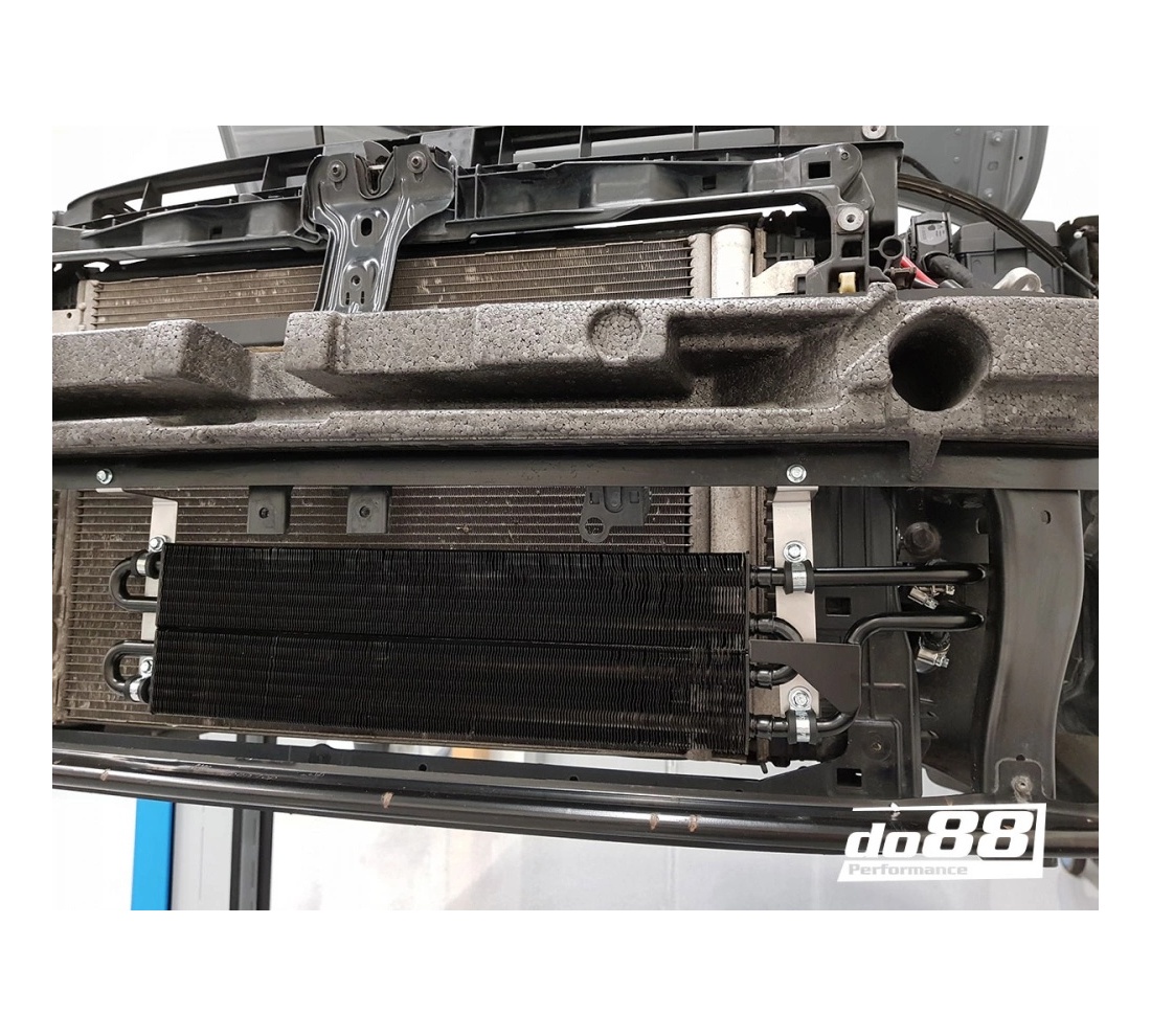The VW Golf R / GTI Clubsport / ED40 already has a stock auxiliary radiator for the DSG gearbox to solve the temperature problem. The same radiator setup these models have can be installed on a GTI but it is expensive to do since the entire front bumper etc needs to be changed. The do88 auxiliary radiator pre-cools the cooling water that goes to the gearbox heat exchanger. It is installed in the front of the AC condenser. Hoses, brackets and all other installation hardware are included.